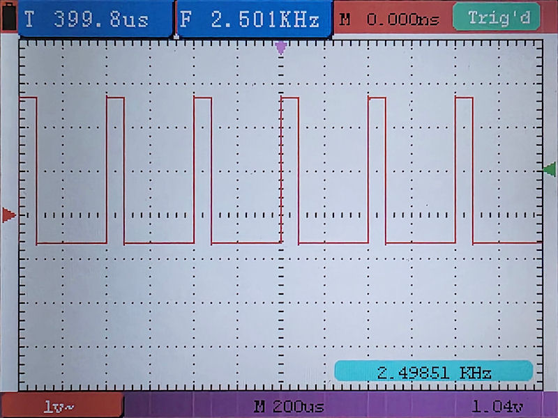After flashing the (GK Radmon) ESP8266 with the ESPGeiger HW firmware I checked set the frequency to 2.5 KHz as noted in the GK Radmon documentation, and I set the duty to 50 (of 255 / around 20%) for now. Then I connected my oscilloscope and checked the PWM signal -it's clean: