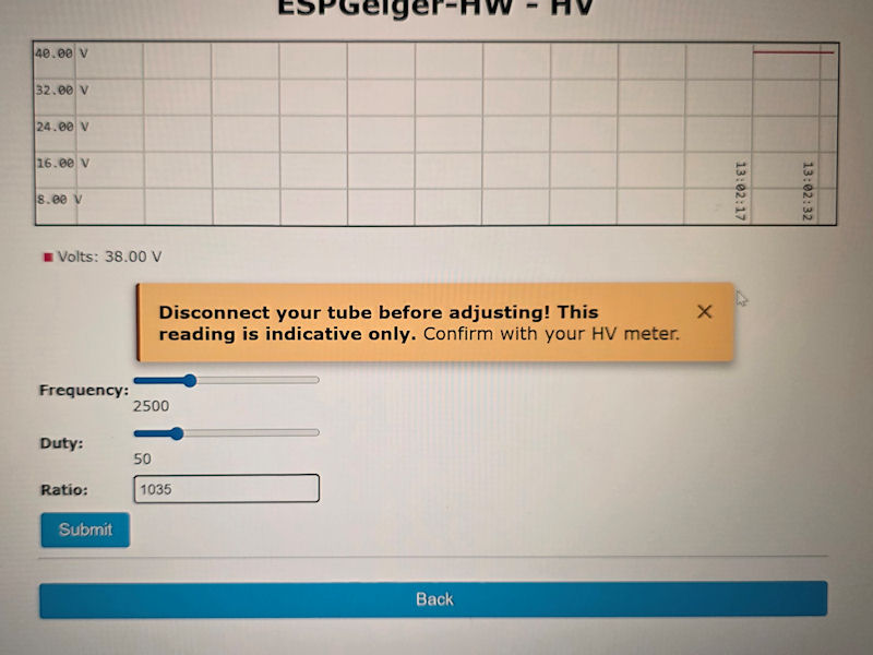 Once the modification to the board has been done, it can be reassembled (plug in ESP8266, OLED), but leave the GM tube out for now to test the HV PSU function and it's voltage, that is after flashing the ESP8266 with the ESPGeiger HW firmware. This version, as far as I know, is the only version of ESPGeiger firmware that has PWM HV control. The HV PSU on both the ESPGeiger HW and the GK Radmon are the same principle - a simple PWM driven boost circuit. A PWM signal from the ESP8266 drives the boost circuit and the voltage is dependant upon it's frequency and duty cycle, and the components used. As the principle is the same then the ESPGeiger firmware should run the GK Radmon HV PSU without issue.